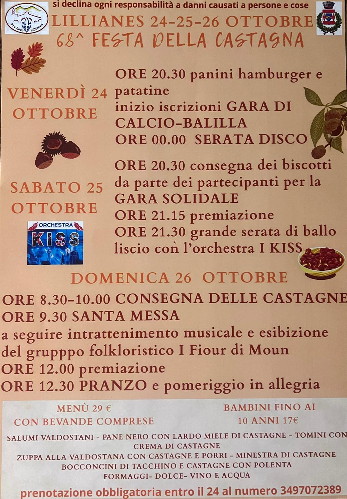Programma della 68^ Festa della Castagna di Lillianes che si terrà nei giorni 24-25-26 ottobre 2025.
